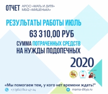 Обращаем ваше внимание, ежемесячные отчеты (в том числе данный) включают поступления и расход средств в рамках благотворительного проекта "Я помогаю детям!". Полный отчет о деятельности АРОО "Мать и дитя" и МБФ "Мишенька" выполняется ежеквартально.